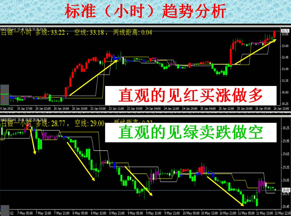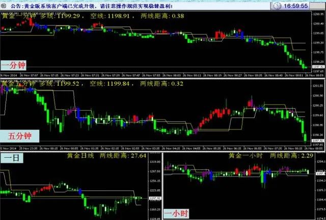 不用研究各种复杂的经济数据,政治动态,也不用研究传统的技术指标。系统界面由1分钟、5分钟、1小时和1日四个版面的K线图组成,每个界面包含多空双线,6种颜色的K线,以及交易品种的实时报价,通过系统可以直观的见红买涨做多,见绿卖跌做空。